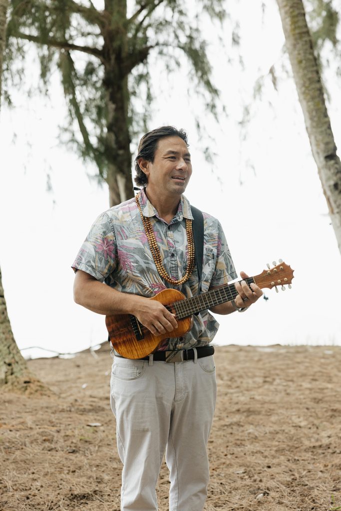Ukulele strums or ipu drum beats are definitely among the best Hawaii wedding traditions, loved by many couples. Play soft Hawaiian melody during seating, while for the “chant,” use a rhythmic oli poem about love and sea, which your officiant can recite neutrally, ”Waves meet shore endlessly, like our bond.”